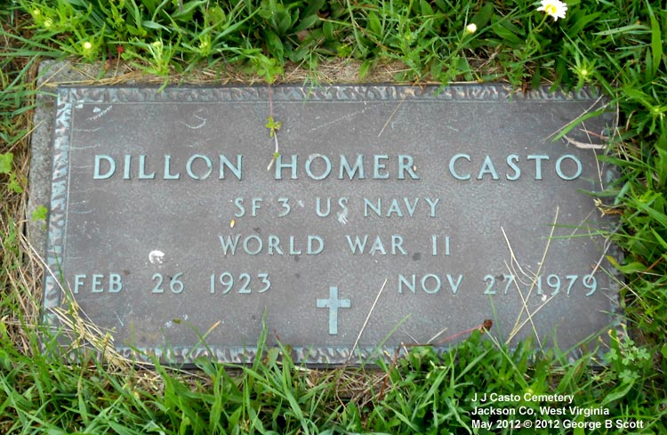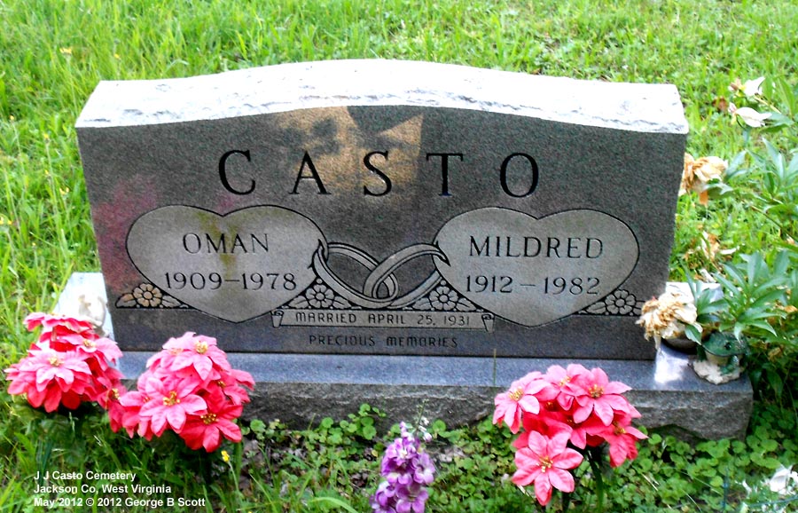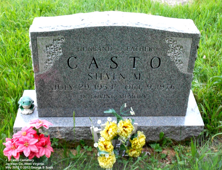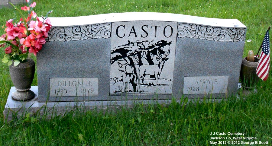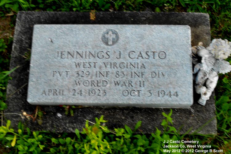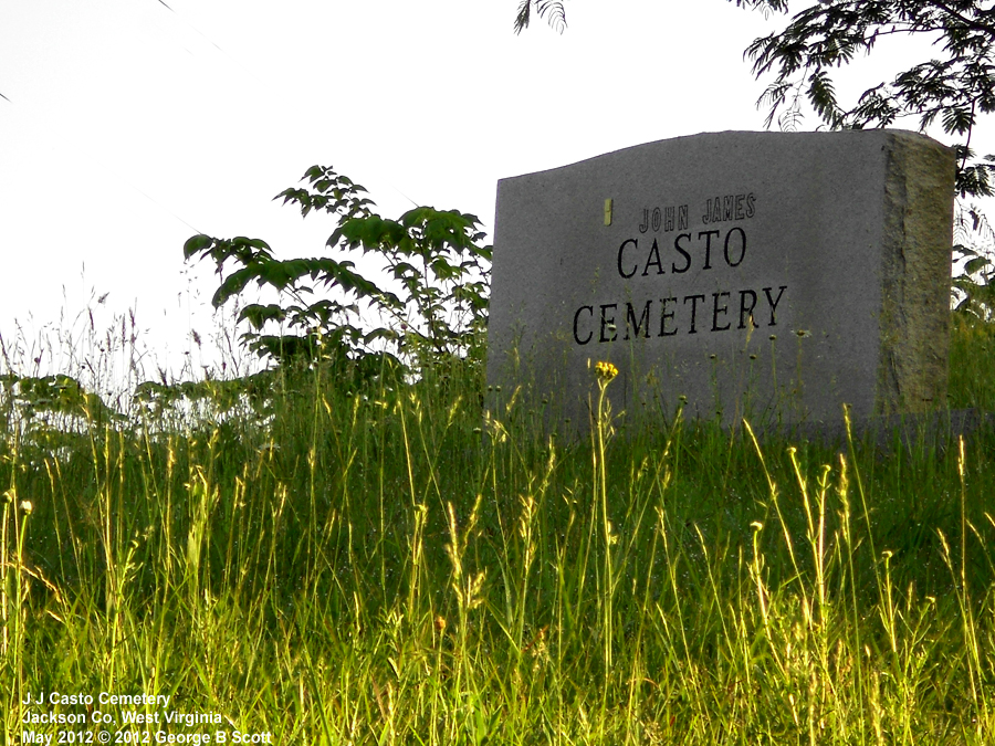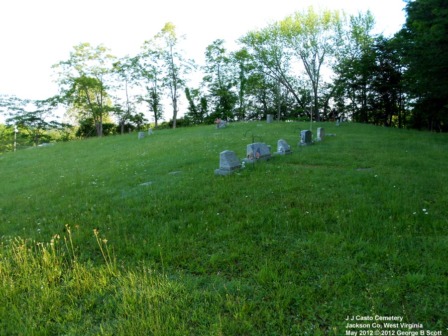 | Accessibility: | Directions: From Ripley, drive east on Rt 33 about 1.5 miles. There is a monument on the right side of the road, part way up a little hill, that says John James Casto Cemetery. Turn onto that little road and you can drive around to a parking place. It is just before a fairly sharp curve in the road and if you get to CR 5/12, you just missed it. It's a fairly small cemetery, unfenced but well cared for. | |