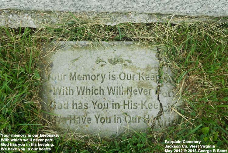 access. From Ripley, go south on I-77 and take Exit 132. Merge right (south) onto Co Rd 21/Charleston Rd and go 0.3 mile. There is a sign there indicating the Cemetery is to the left. Turn slight left (east) onto Cemetery Rd and go 0.1 mile. Turn left onto Cemetery Rd and go 0.1 mile. Cemetery is on left and is divided into six sections by access roads. Cemetery is large (about 1800 graves) and 5