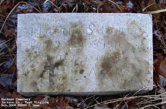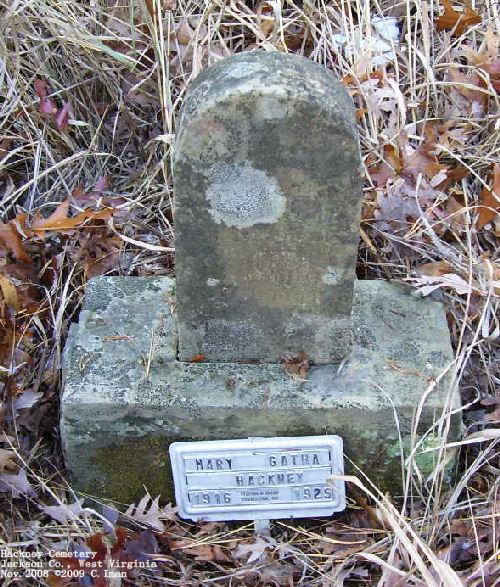 Accessibility: | The Hackney Cemetery is located in Jackson County, between Sissonville and Advent. From Charleston, travel I-77 N to Exit 116, turn right and travel approximately 200' to CR-21. Turn right on CR-21, travel approximately 1/4 mile, turn left onto Poca River Road (CR-33). Proceed on Poca River Road for 5.1 miles, turn left across bridge onto Cicerone Road. Cicerone Road maintains the CR-33 designation. Travel 4.0 miles to Allens Branch CR 33/8. Turn left on Allens Branch and travel approximately 2 miles, the road forks, take the right fork. Proceed to the top of the hill. Evidence of a road leading to the left can be seem, follow this road to the top of the hill. The road from the forks may become impassible after periods of heavy rain or snow. | |