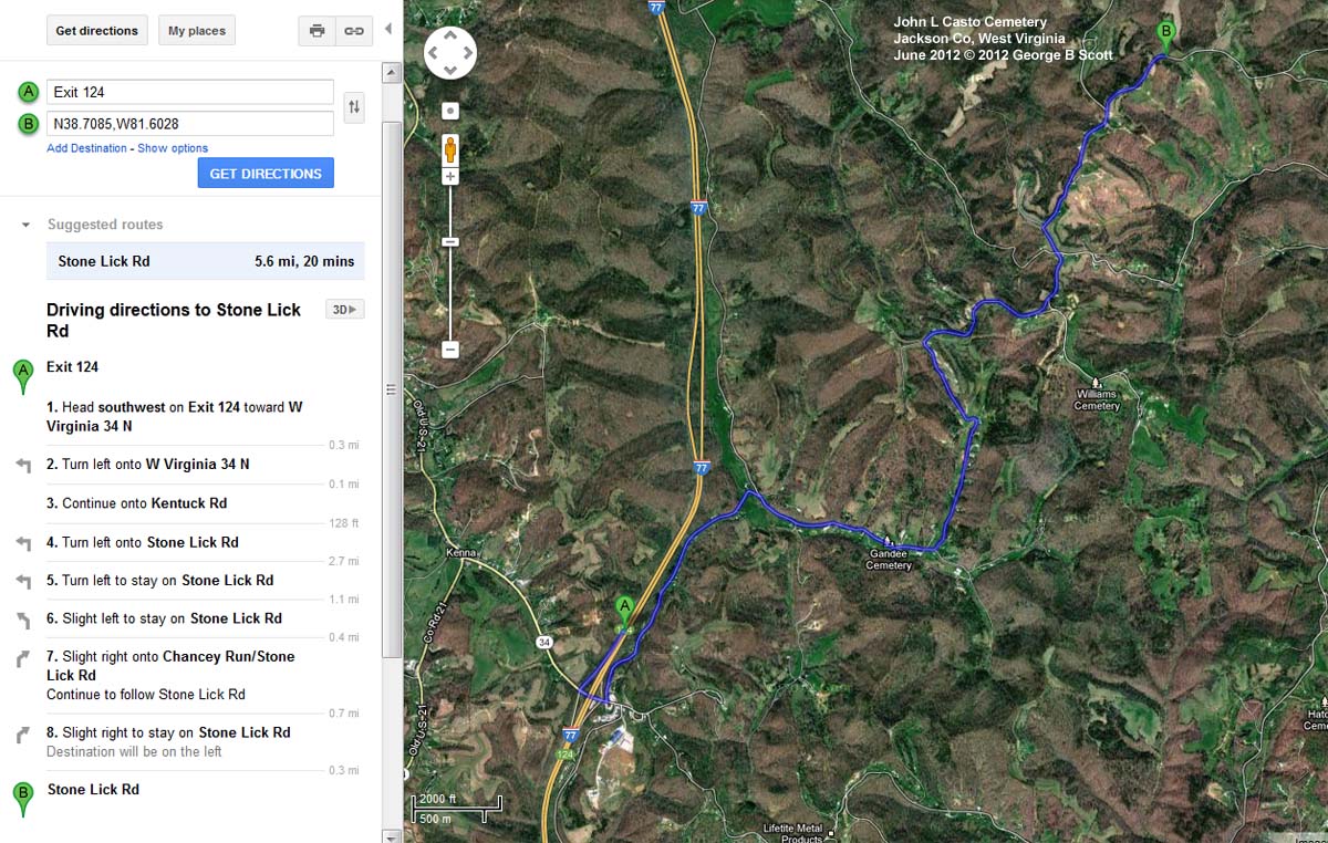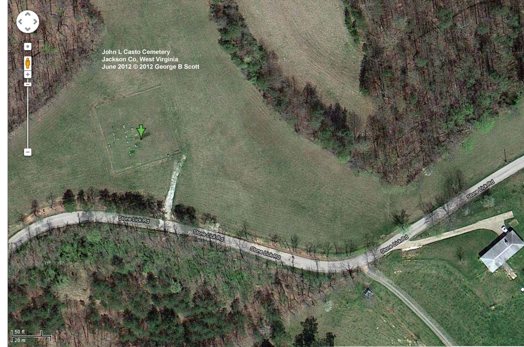 Easy Access. From Ripley, take I-77 south and exit 124. At Rt 34, turn left and go under freeway. On east side of freeway, take first left onto Stone Lick Rd and stay on Stone Lick Rd for next 5.2 miles. Cemetery is on left (north) side of road.