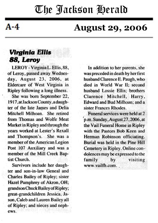 [Dau. of James & Delia Milhoan, wife of Clarence Paugh & Lossie Ellis - from her obituary in the Jackson Herald Aug. 29, 2006]