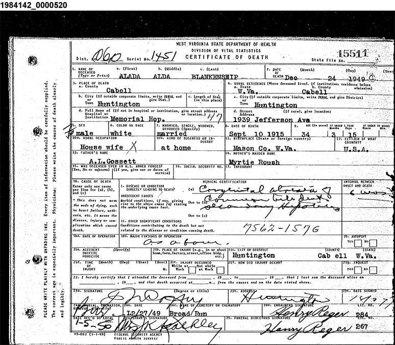 [Dau of A L Gossett and Myrtie Roush, spouse of Walter Blankenship] |
