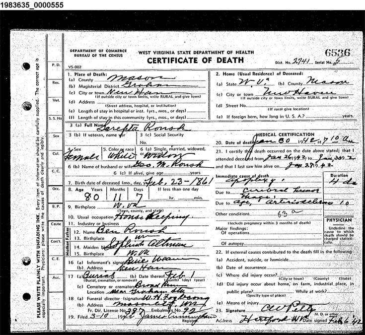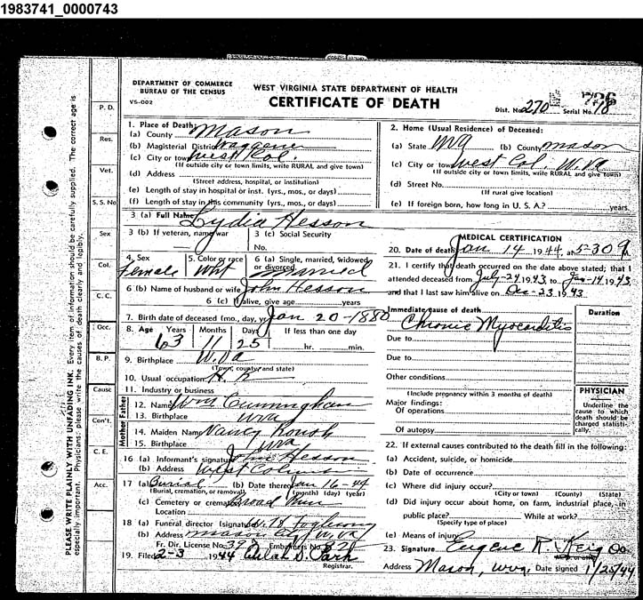 [married 1898 John Hesson, dau of William Cunningham and Nancy Roush] |