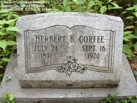 Corfee | Herbert B. | 24 July 1891 | 16 September 1920 | [Son of George & Mary Corfee, husband of Clara Belle (Clara is buried at nearby Pine Grove Cemetery)] | ![]() |