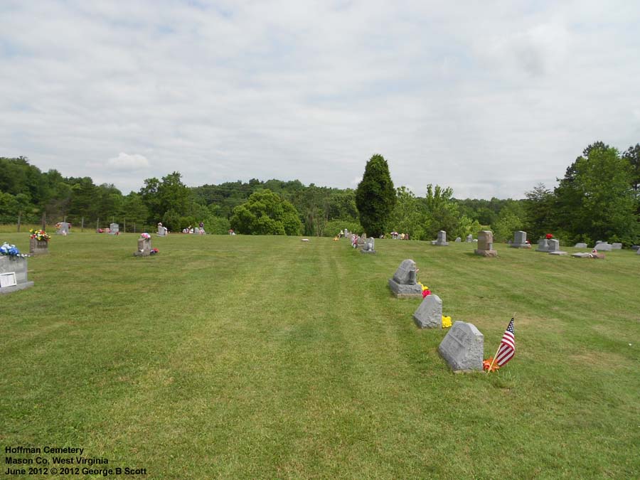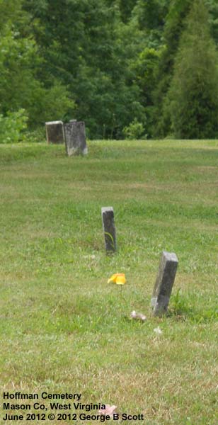 [large group of stone, belived to be Hoffman, are near the largest conifer in the cemetery. The very few readable stones are all of the Hoffman family] |