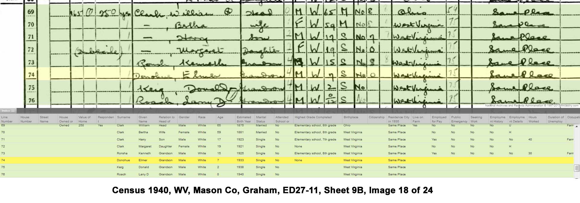 [Gale F Donohue and Betha E Clark, dau of Bertha Hoffman and William Clark were parents of Elmer Gale Donohue, b 1933. Gale F married Lillian H Simpson in 1934] |