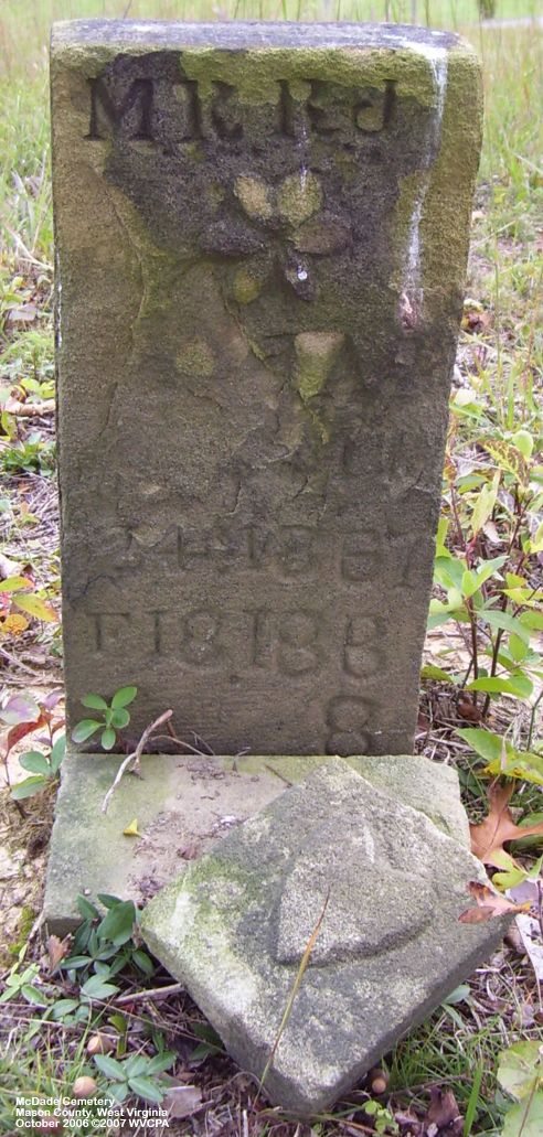 Dates in Red above are not inscribed on the tombstone and have either been calculated based on death date or are as a result of research on the individual. According to an earlier reading published in the Mason Co., W.Va. Cemetery Inscriptions book for this district, there were three graves marked with stones and visible in the late 1960's/ early 1970's. When we visited the cemetery in October 2006, there were only 2 markers clearly visible. There was, what appeared to be another marker, broken and laying at the base of R.J. McDade's stone, though that may have been his footstone. There were no legible carvings on that stone, other than a large heart that you can see in the close-up photo of his stone. It is possible that this was the "third" marker identified 30+ years ago, though we cannot be certain. There was at least one fieldstone in the area, but there was no present indication that they were marking graves or if they were naturally occurring stones. Are there any McDade family researchers out there that can help us understand more of this cemetery and those buried here or possibly buried here? Please email WVCPA. |