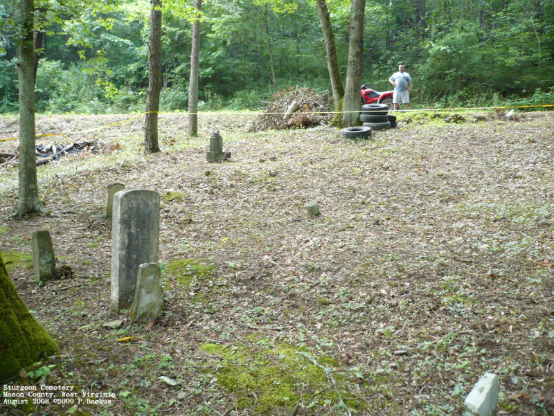 Driving directions, per WVCPA contributor Pam Backus: Take Rt. 35 to Fraziers Bottom, turn onto Stave Branch in front of fire department. Go about 1.3 miles then turn right on Evergreen Road (a new Rt. 35 is being built right now 2008/09 and eventually the route will change a little bit, but you will still need to turn onto Evergreen Road). After turning onto Evergreen, continue about 3 miles then turn left onto Hughey Fork Road (it sometimes has a road sign, and sometimes it is stolen). Hughey Fork Road is at the bottom of a hill (if you pass Evergreen Church of Christ you have gone to far), and is a gravel road per August 2008. Travel about 3 miles, then at the bottom of large hill turn left onto an unnamed gravel road and go 0.4 mile, turn left on another unnamed gravel road (it's known locally as White Pine Rd. or 18 Mile Rd. - not known to have ever been marked with a sign as being either of these, though). Drive about 0.6 mile and the cemetery will be on the left alongside of the road. |
