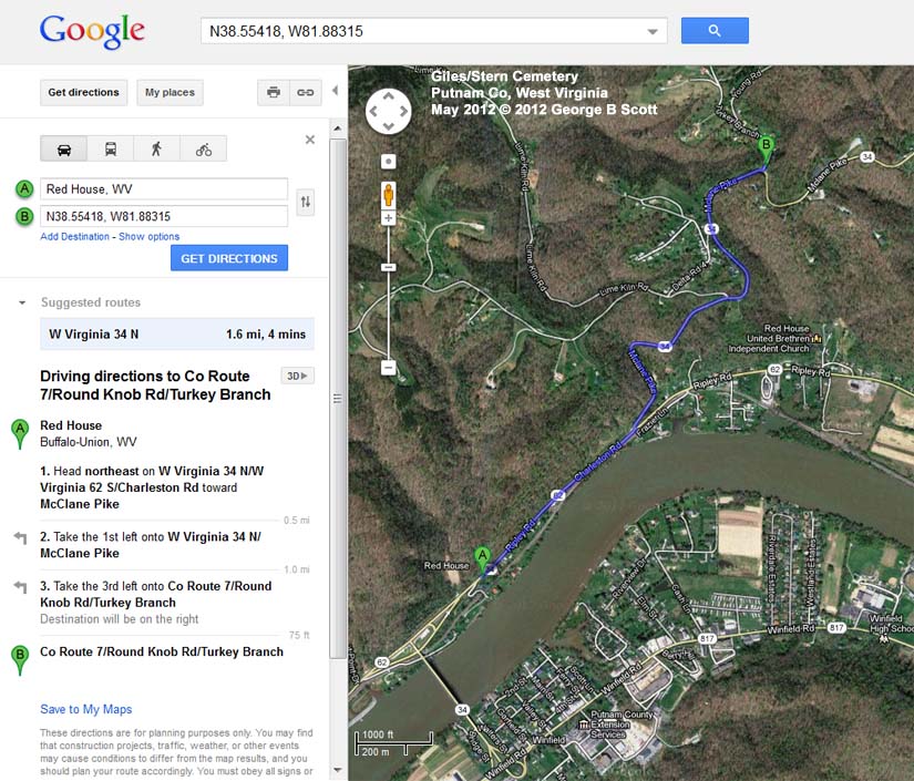 | Accessibility: | Easy Access. From Red House, go 0.5 miles northeast on WV34 N/WV 62 2/ Charleston Rd toward McClane Pike. Take first left onto WV 34N/McClane Pike and go 1 mile. Cemetery is at intersection of McClane Pike and Round Knob Rd / Turkey Branch Rd | |
